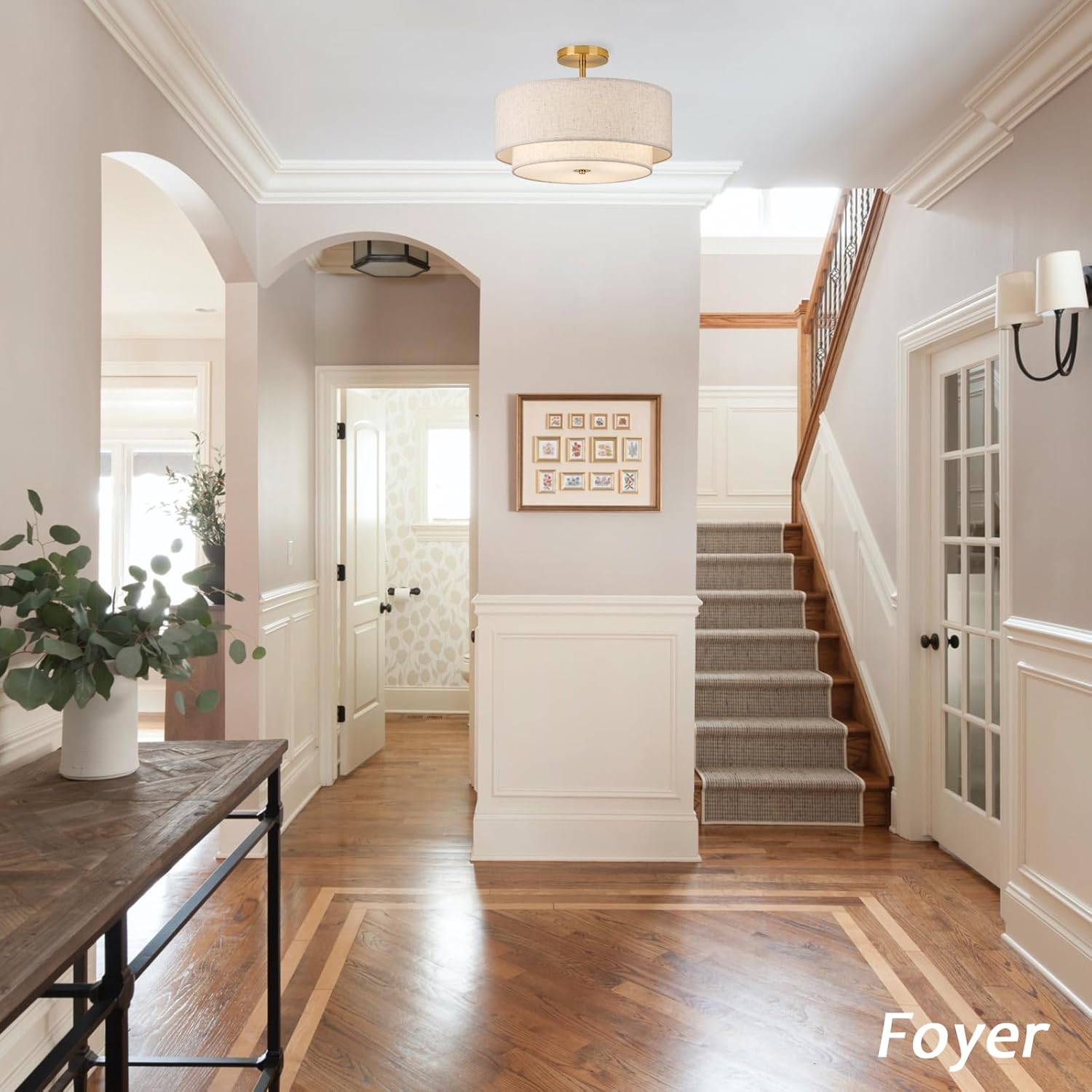 16" Double Drum Gold 3-Light Semi Flush Mount Ceiling Light, Classic Fabric Linen Shade Design for Living Room, Bedroom, Kitchen, Dining Room, Hallway and Entryway