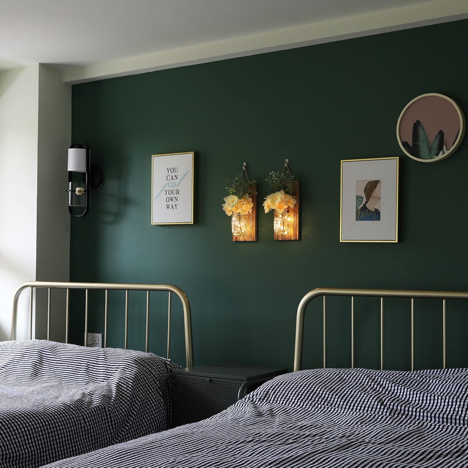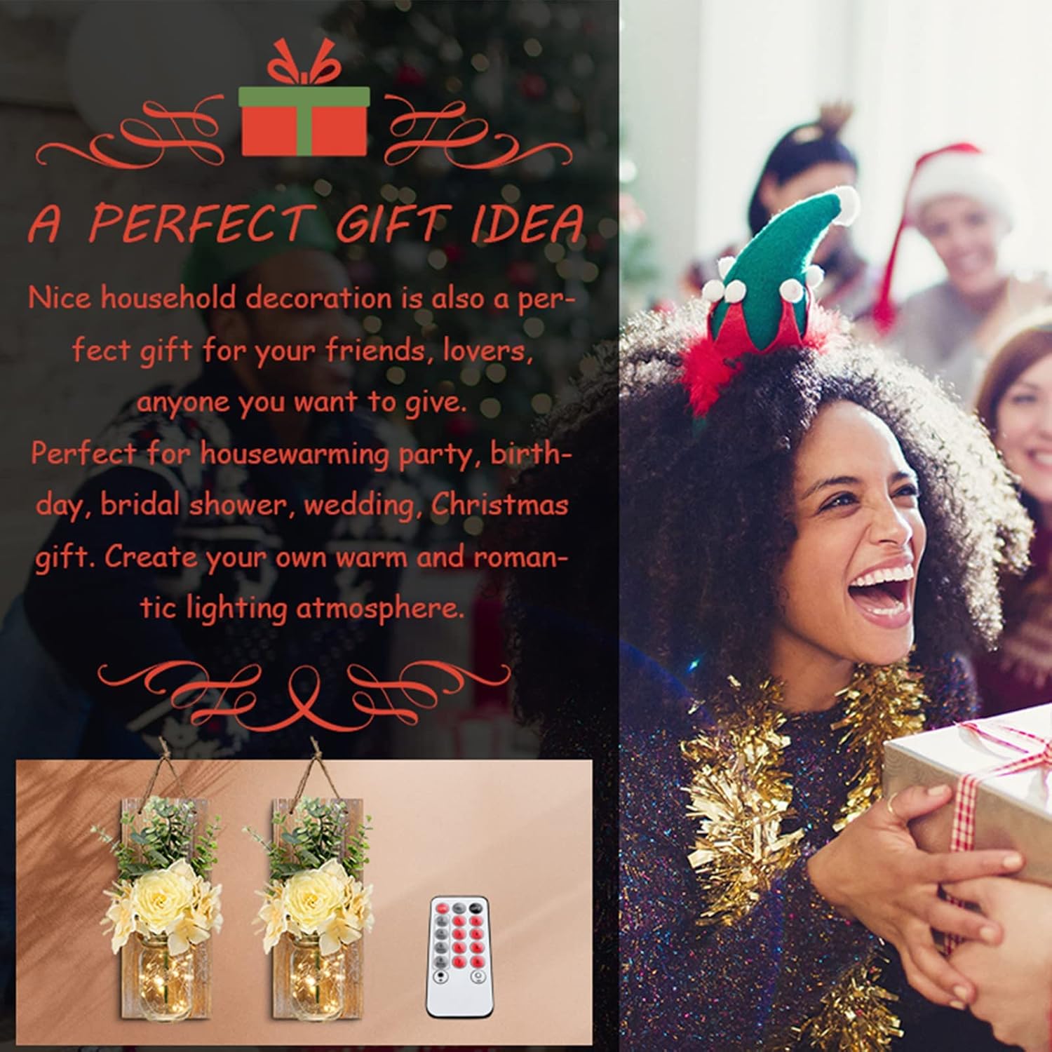 HOMKO Rustic Wall Decor, Mason Jars Wall Sconces, with Remote Control LED Lights and Flowers, Hanging Rural Farmhouse Kitchen Bathroom Bedroom Living Room Home Decor (Set of 2) -Rustic Brown