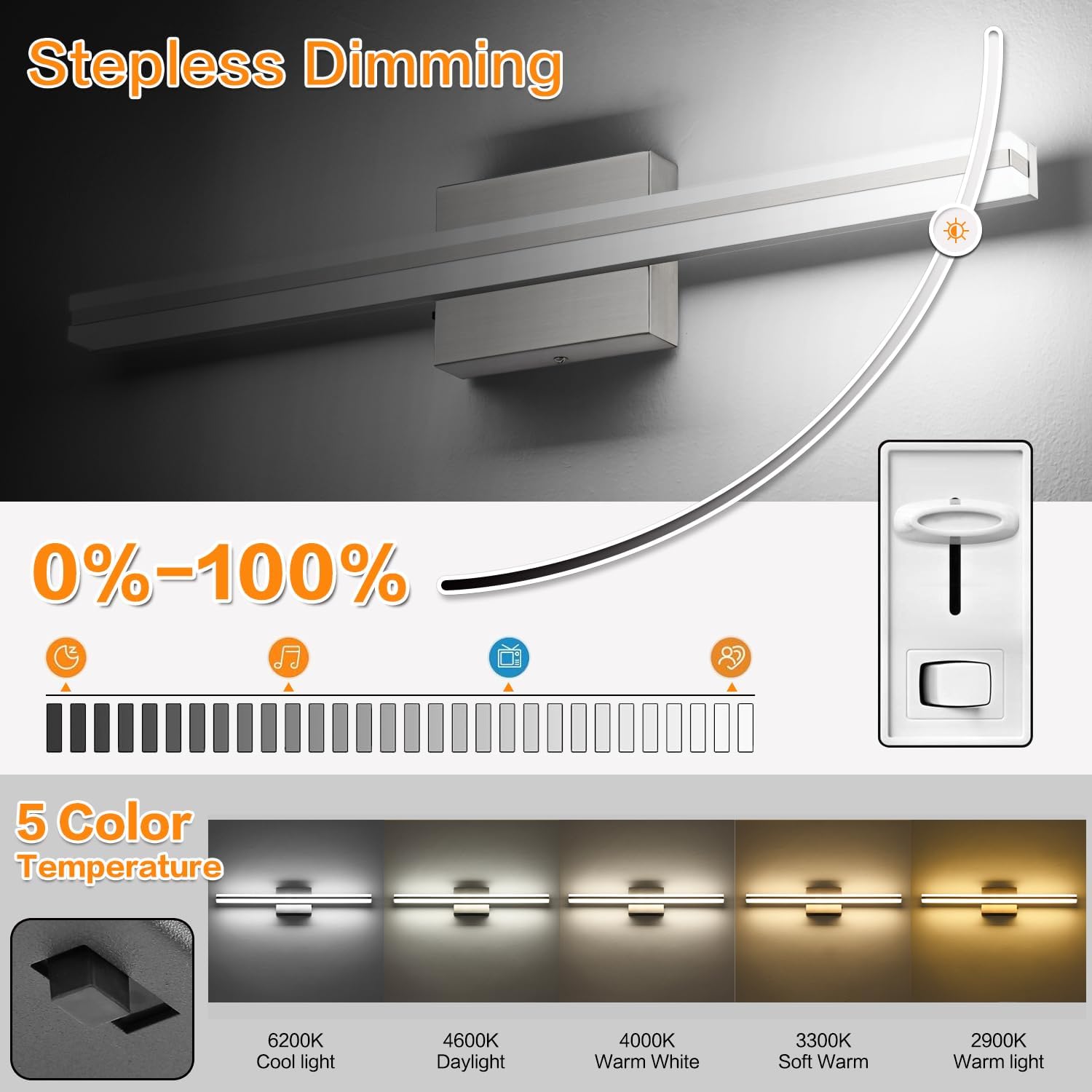 SOLFART Bathroom Light Fixtures Over Mirror 24 Inch Brushed Nickel Modern Vanity Light 5CCT Adjustable Brightness LED Mirror Light Fixture Anti-Glare Lighting Wide Illumination