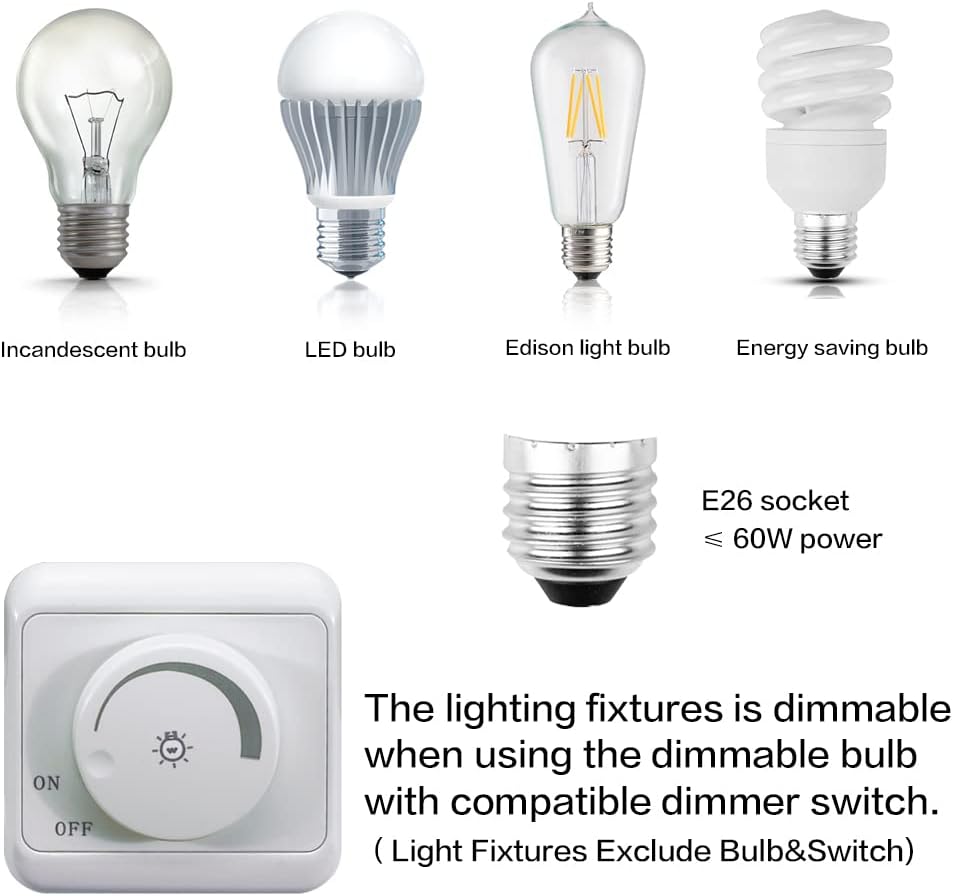 - Socket Type: E26 Socket (Not include the bulb, Please purchase separately ! You could choose Warm Light or White Light Bulb) ,Suitable For LED bulb, Save energy bulb,Halogen bulb,Tungsten bulb.