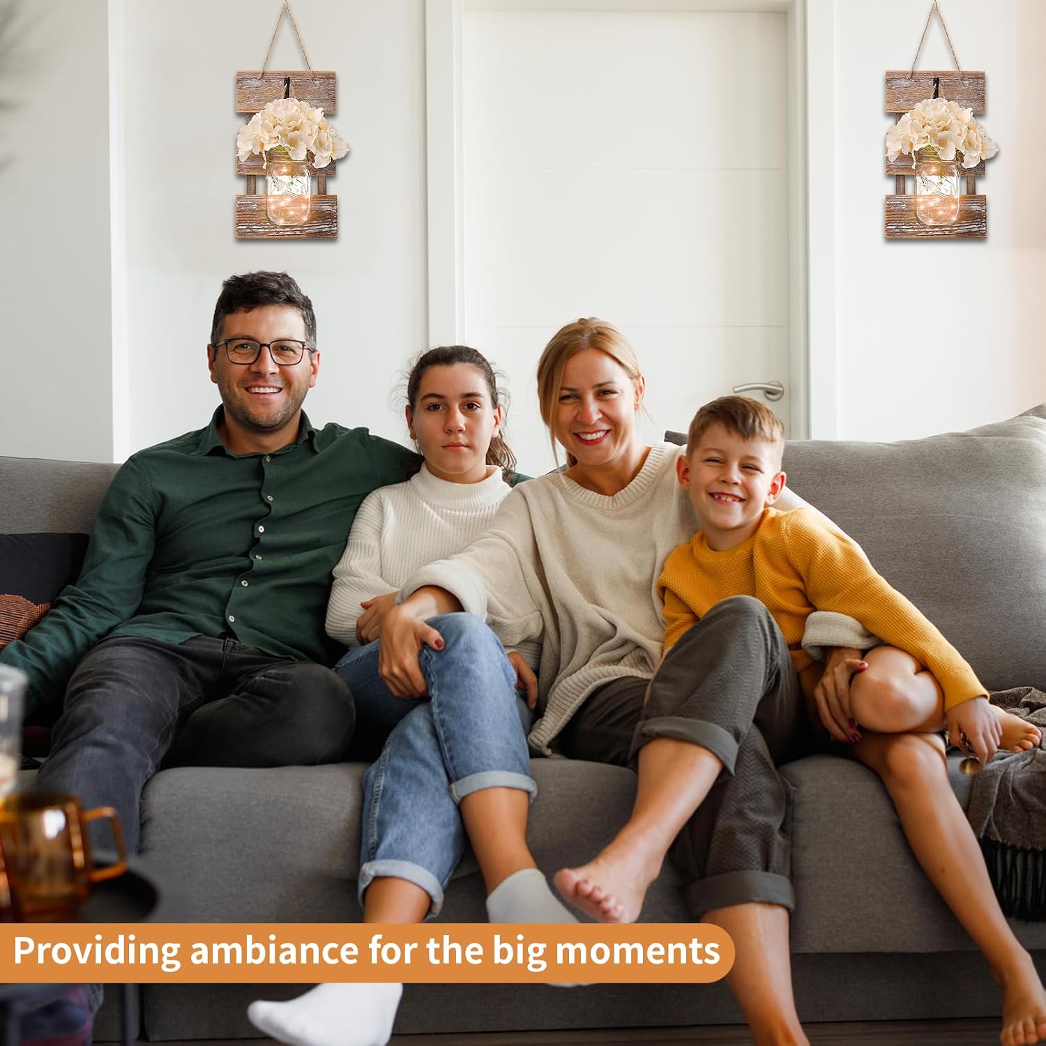 Wall Sconce Decor 2pcs, Mason Jar Wall Sconce Farmhouse Home Decor with 9.8FT LED Fairy Lights 4Flowers, Modern Art Living Room Bedroom Bathroom Decorative Hanging Yellow